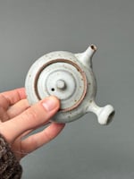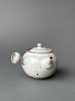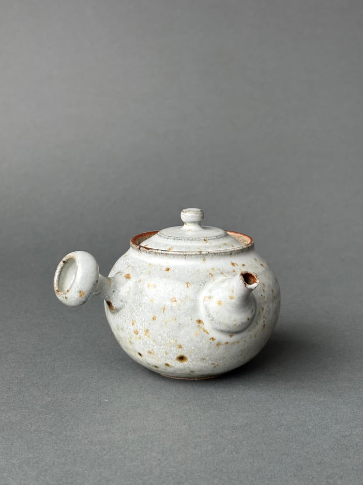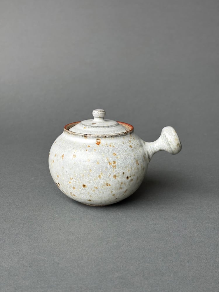 -Wheel-thrown and handmade stoneware left-handed kyusu teapot in nuka ash glaze.